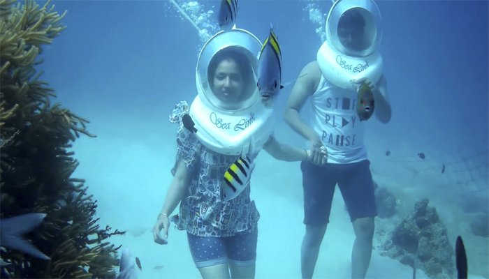 Sea walking in Andaman is one of the newest and most exciting ways to enjoy the exotic marine life of the islands. Being one of the most direct ways to witness the beautiful underwater sea life of the area, the activity is full of fun and distraction.The Sea walking equipments are very easy to handle. You feels very cosy when you walk on the sea floor's smooth sand. After wearing sea walking helmat you can explore the ultimate marine under water life and colourful fishes diffrent species. You can also take the unforgettable photos of marine life underwater.